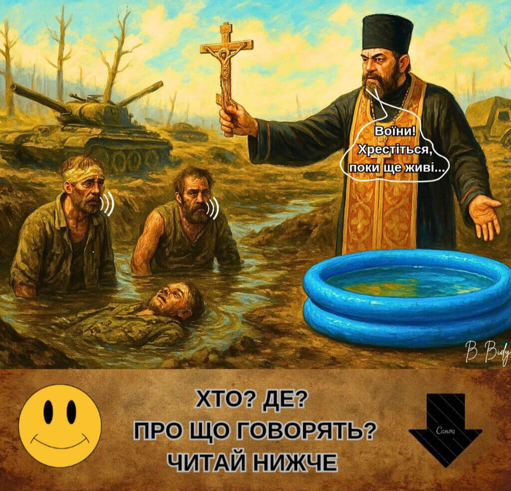 Російсько-український фронт. Російські позиції. Священик агітує солдатів охреститися в похідній «купелі».