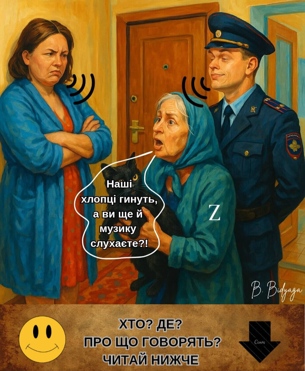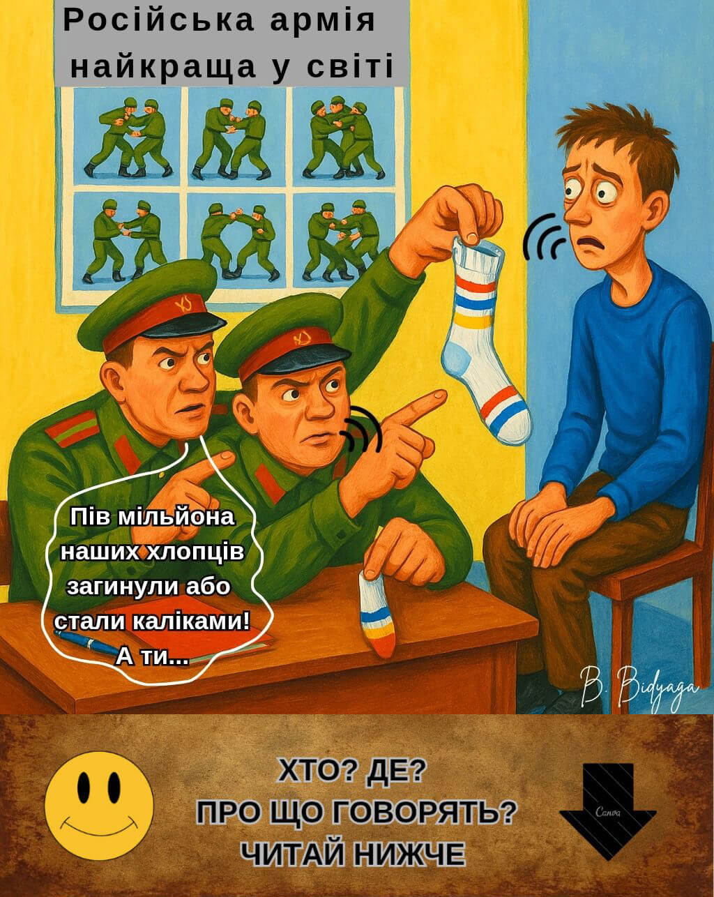 — Пів мільйона наших хлопців загинули або стали каліками! А ти — на вечірці розважаєшся голяка з шкарпеткою на члені?!