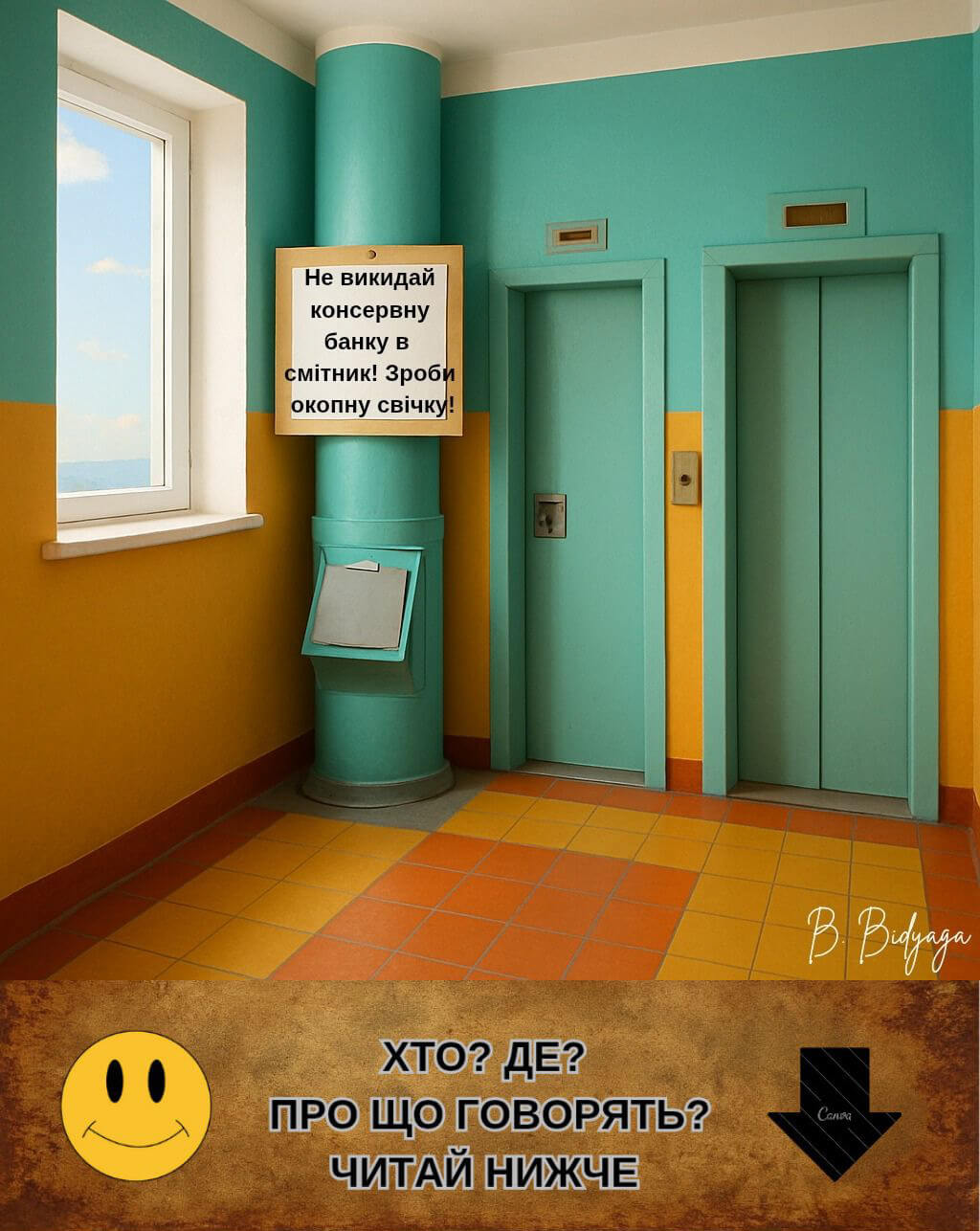 Росія. Москва. Передліфтовий хол звичайної багатоповерхівки. Оголошення на сміттєпроводі: «Не викидай консервну банку в смітник! Зроби окопну свічку!»