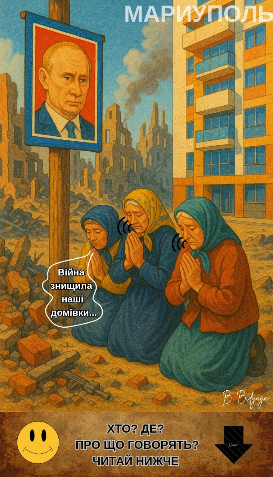 Зруйноване українське місто Маріуполь. На тлі свіжозбудованої багатоповерхівки три жінки моляться перед портретом Путіна.