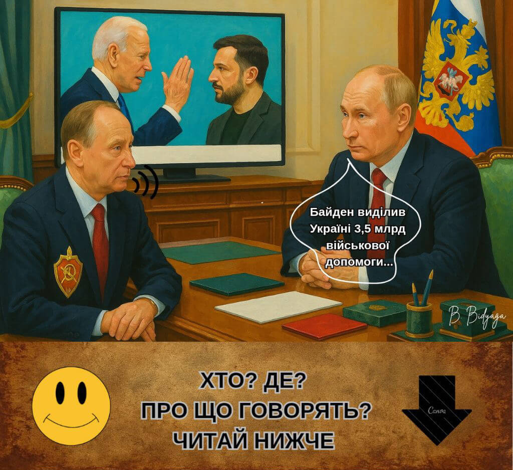 Росія. Москва. Кремль. У кабінеті за столом сидять: президент Росії Володимир Путін та Секретар Ради безпеки РФ Патрушев М.П. На екрані телевізора президент США Джо Байден тисне руку президенту України Володимиру Зеленському.