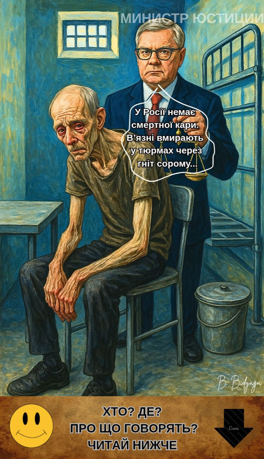 Типова російська тюремна камера. Дуже виснажений хворий в’язень. За його спиною стоїть міністр юстиції Російської Федерації Костянтин Чуйченко з символом богині Феміди в руках.