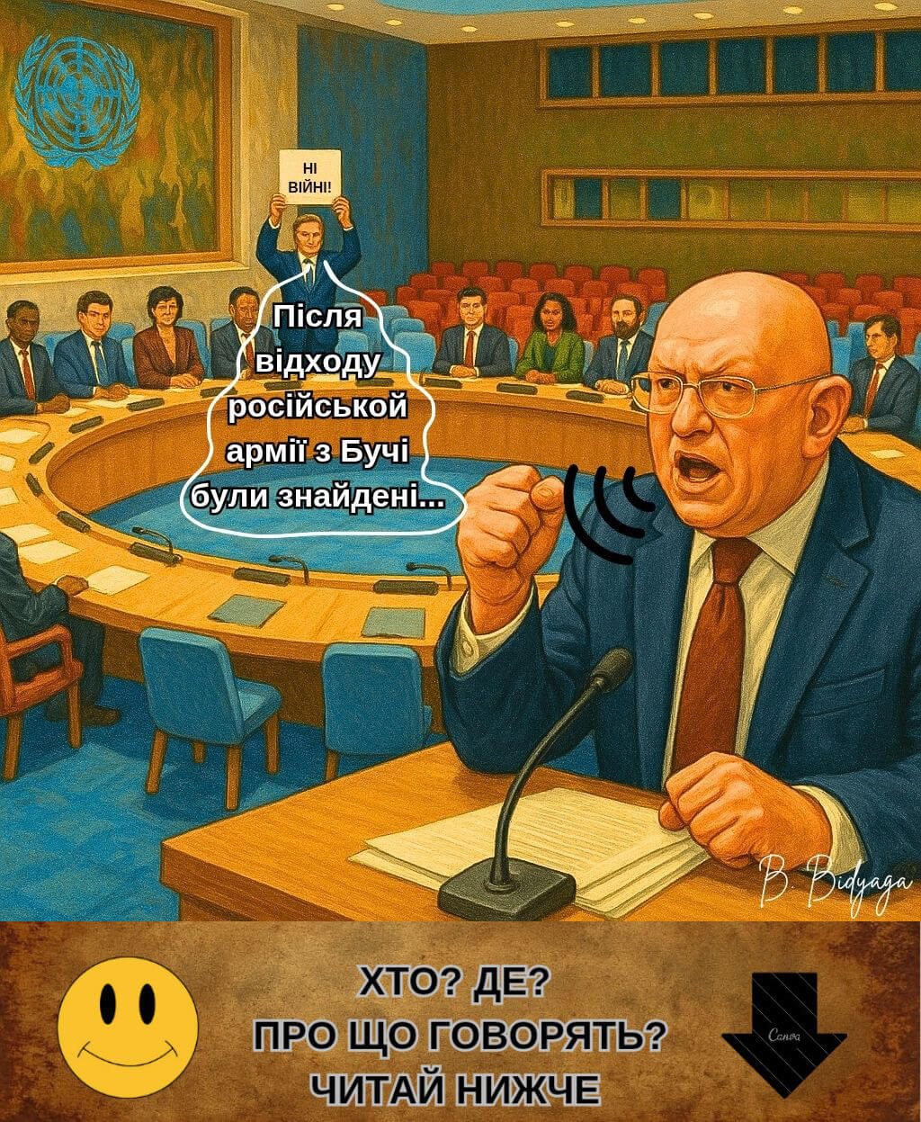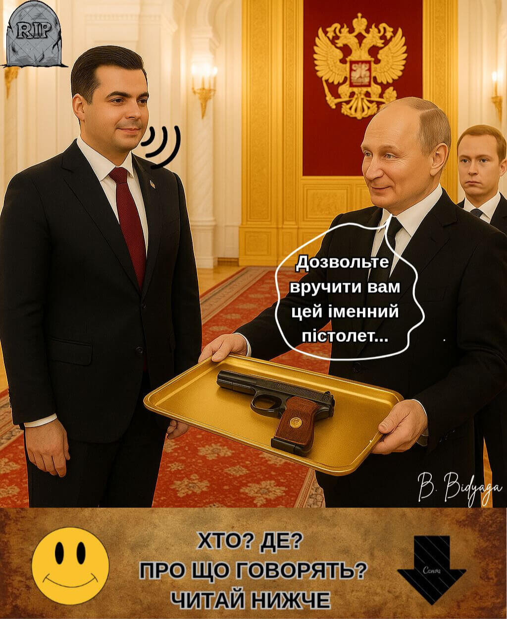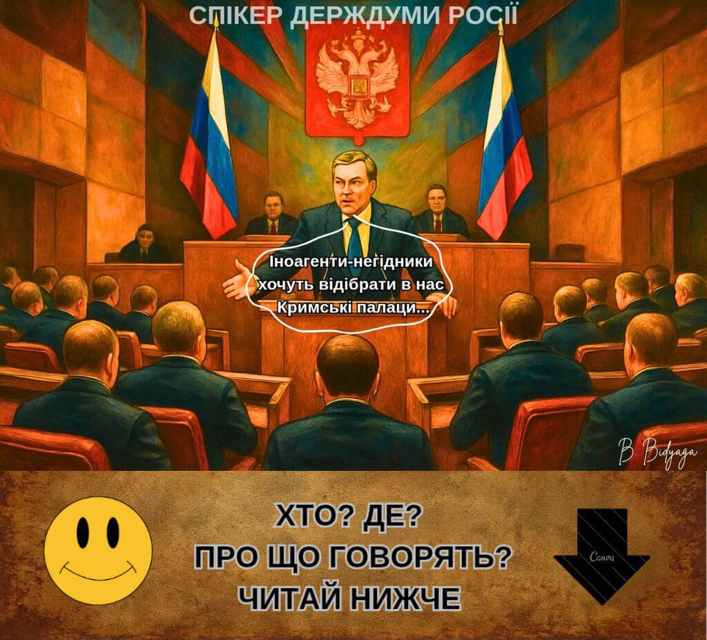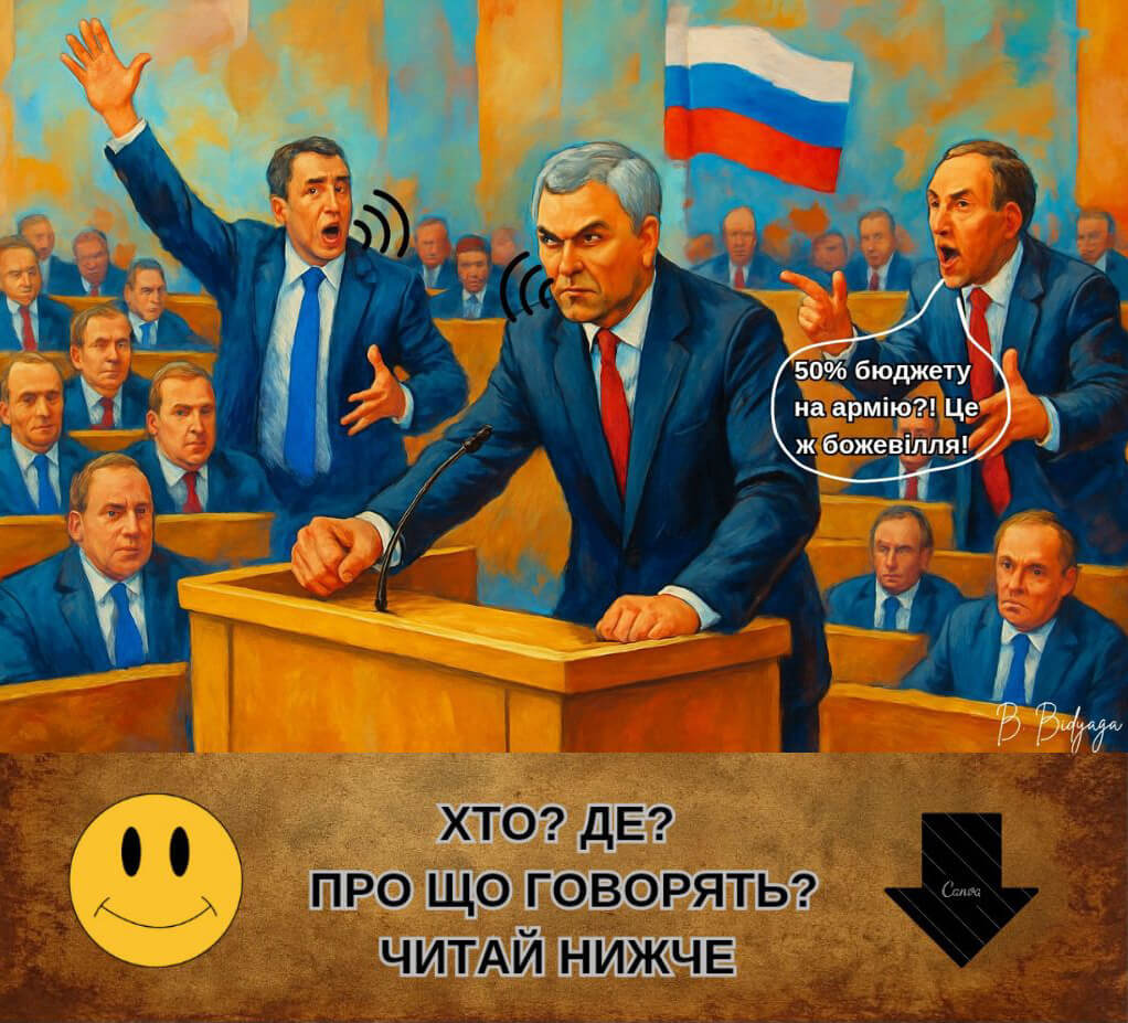 — Наша священна мета — демилітаризація України! Треба йти на жертви! На 3D-принтері гармати не друкувати, знаєте. Перший депутат (з гірким сміхом):