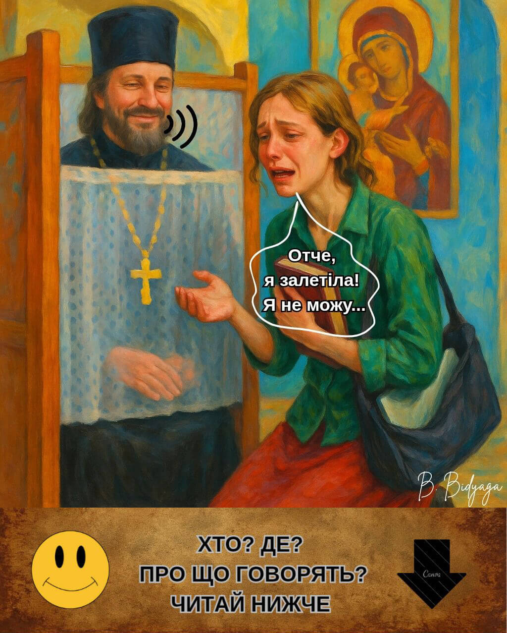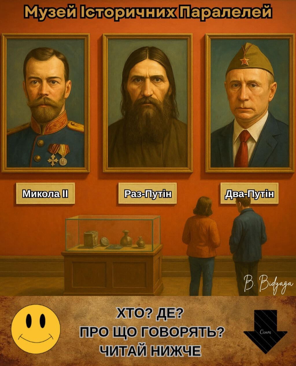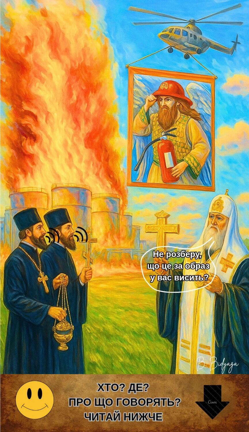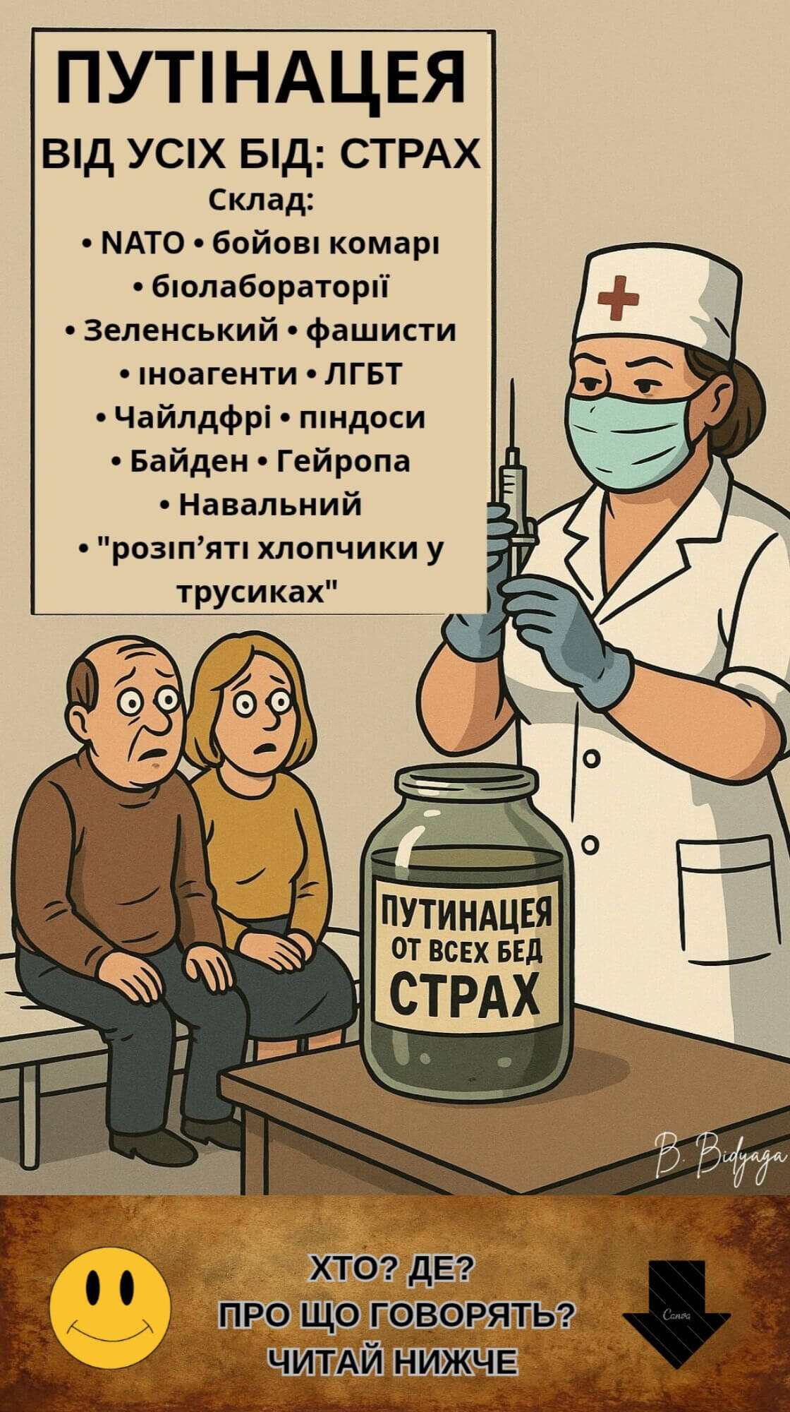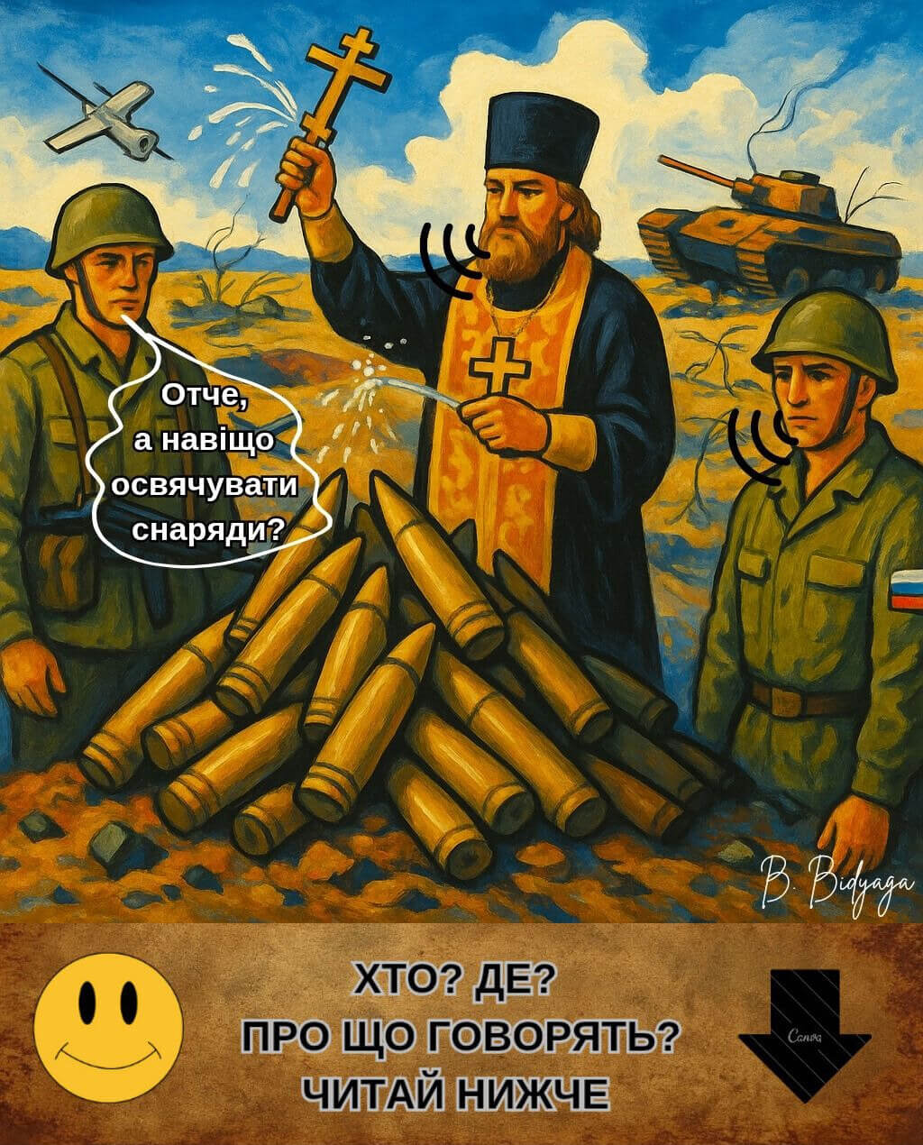 Перед вами — не просто збірка карикатур. Це — анатомічний аналіз путінської епохи: православний воєнний путінізм як форма колективного божевілля. Тут — ікони з язичницькими богами, хрещення в окопах, свята вода — внутрішньом’язово. Тут — патріотизм із шкарпеткою на пенісі й бойові дельфіни Пентагону. У мініатюрах перед читачем постає країна, де війна витіснила здоровий глузд, «скріпи» — совість, а православ’я стало “мастилом” для ракетних установок. Тут священники благословляють насильство, депутати торгують патріотизмом, а школа вчить не думати, а народжувати й коритися.