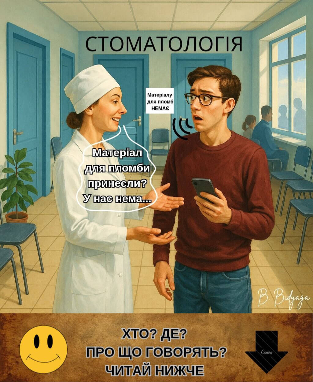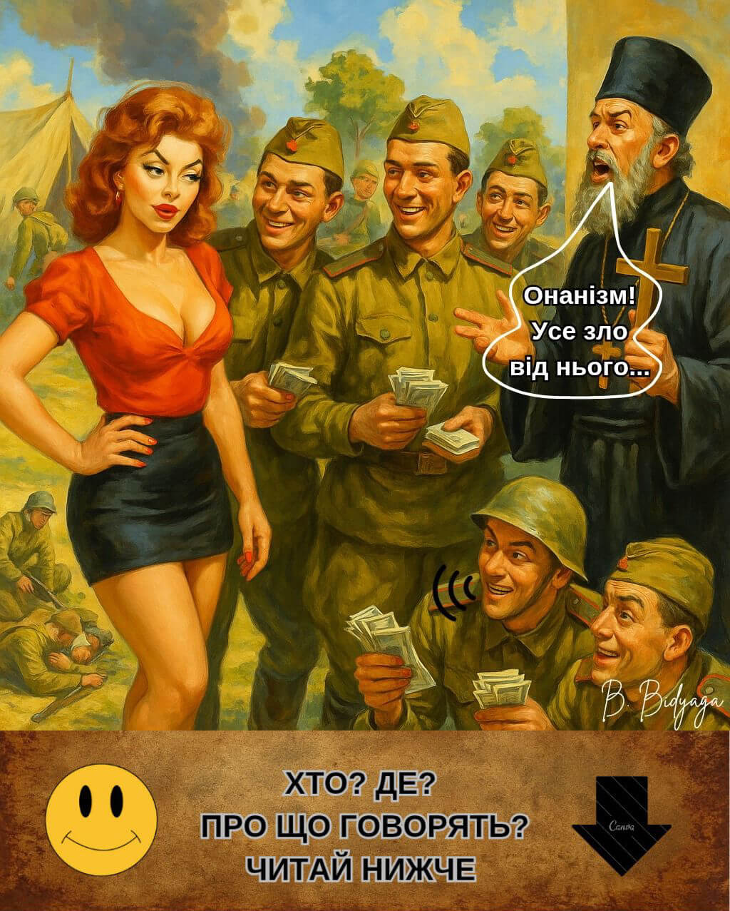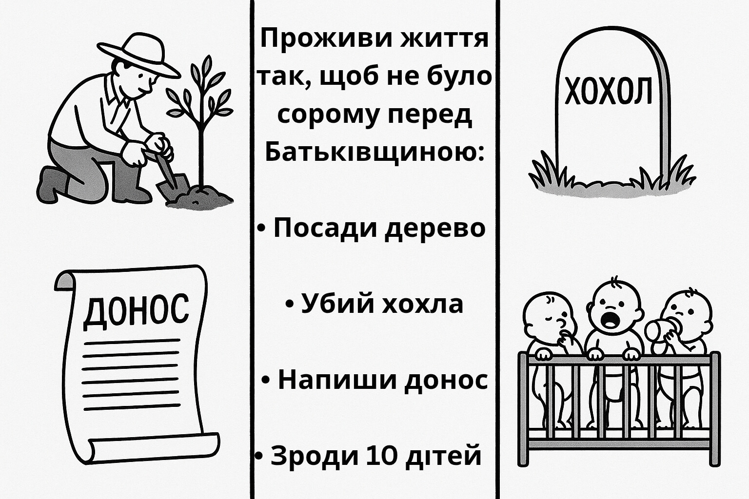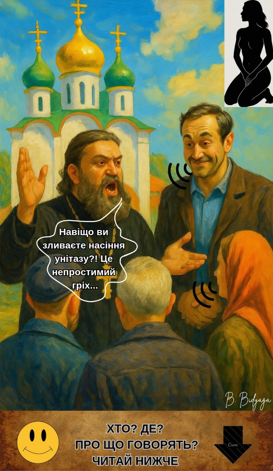 Дякуємо, що були з нами! Ваші лайки, репости та реклама нашого каналу — найкраща підтримка, яка допомагає проєкту жити й розвиватися. Якщо чорний гумор автора припав Вам до душі — пропонуємо ознайомитися з ще більш гротескним твором автора — сатиричною міні-п’єсою з ілюстраціями «Встаюча з колін»: