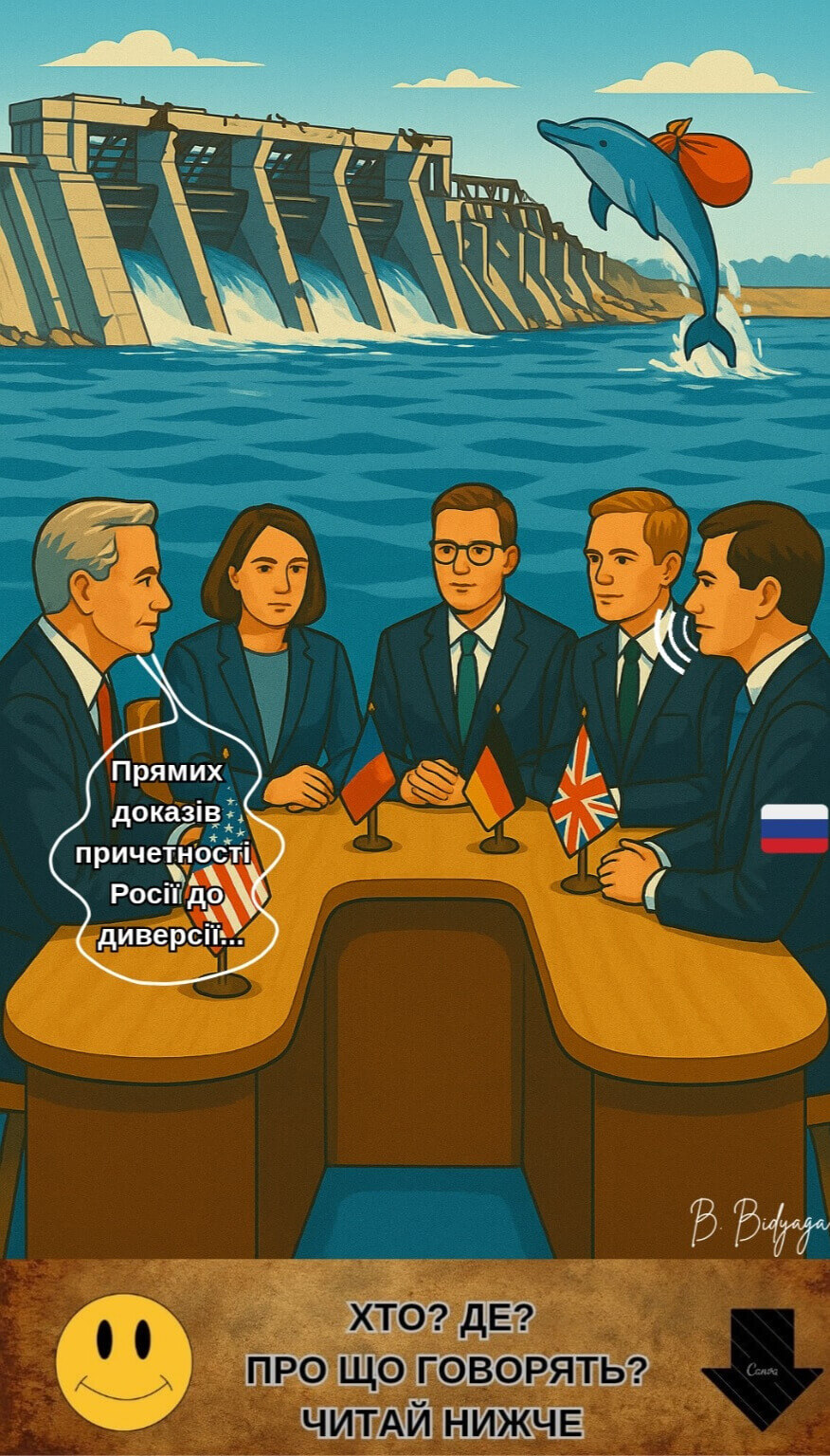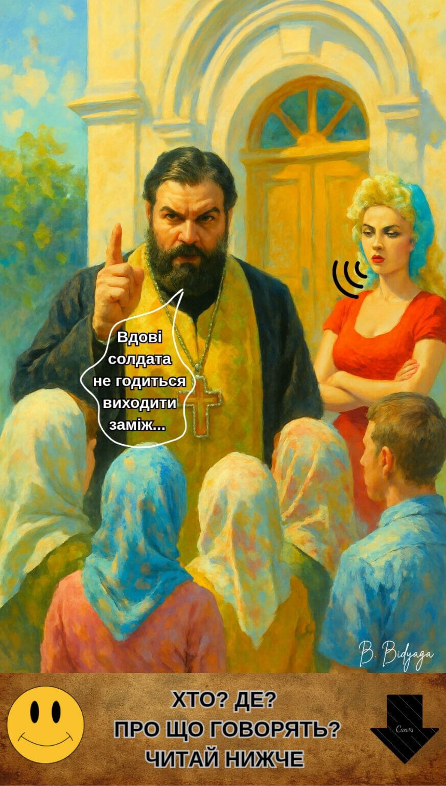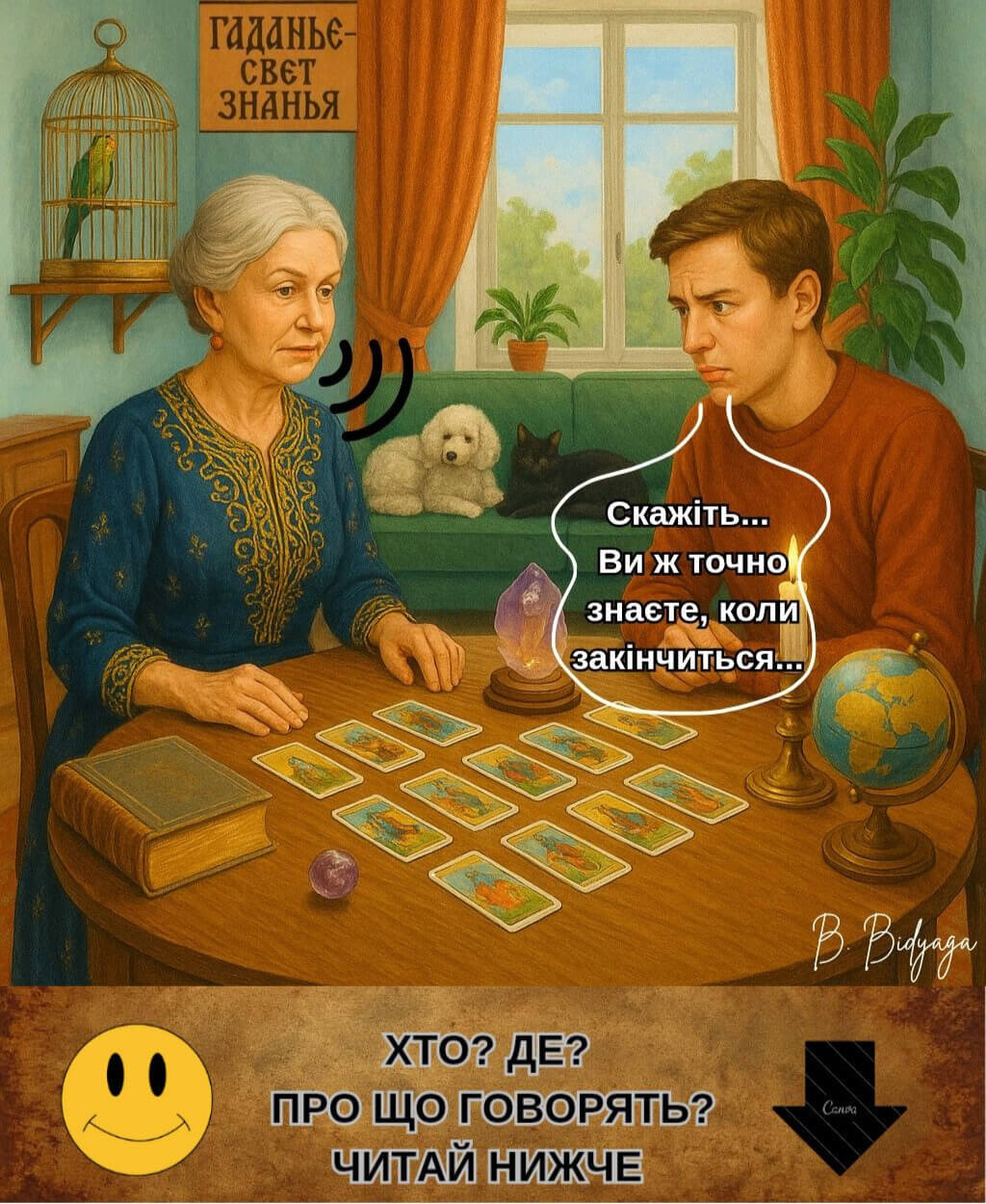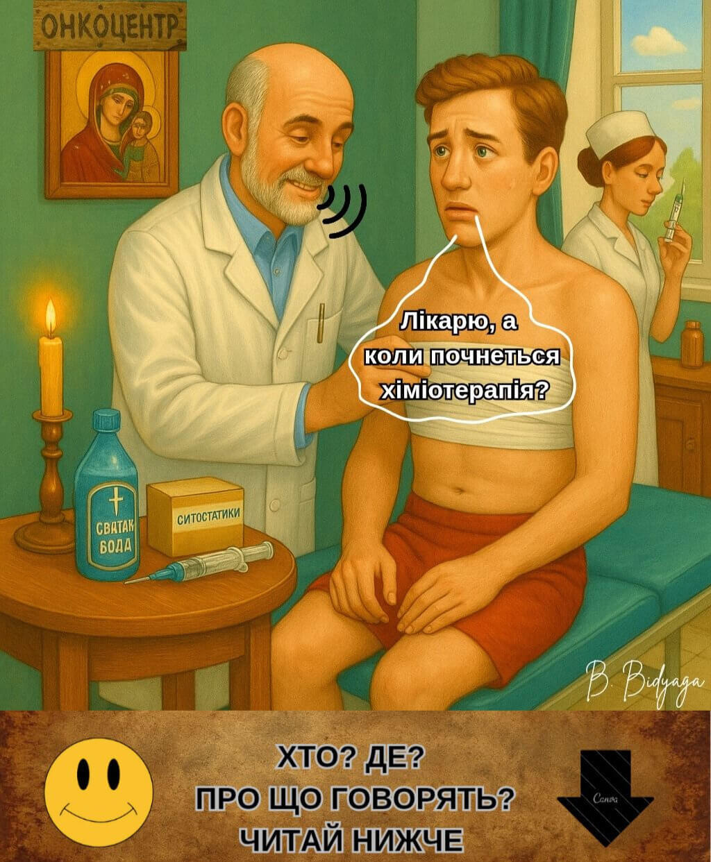 Дякуємо, що були з нами! Ваші лайки, репости та реклама нашого каналу — найкраща підтримка, яка допомагає проєкту жити й розвиватися. Якщо чорний гумор автора припав Вам до душі — пропонуємо ознайомитися з ще більш гротескним твором автора — сатиричною міні-п’єсою з ілюстраціями «Встаюча з колін»: