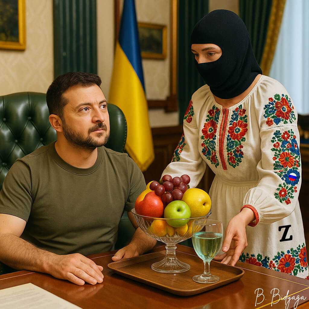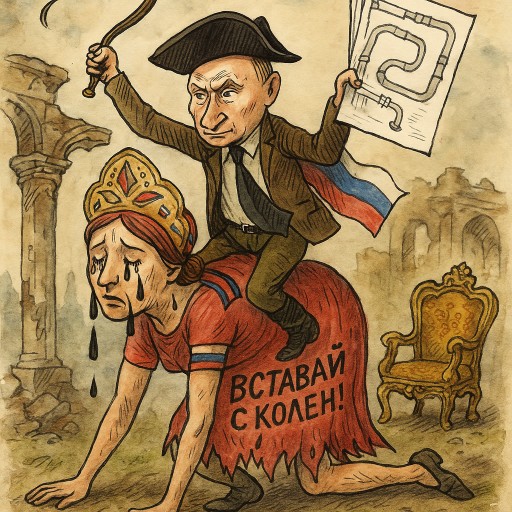 La Russie est à genoux, regardant pensivement devant elle. Poutine entre, en uniforme militaire, bottes à éperons aux pieds. En l’apercevant, il s’écrie avec colère.