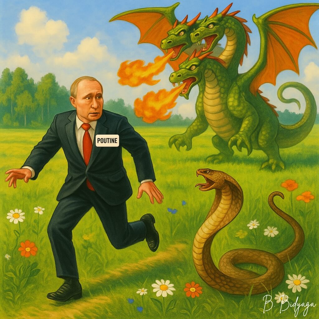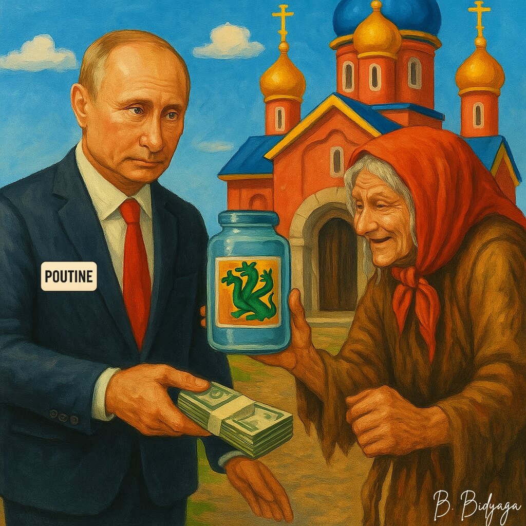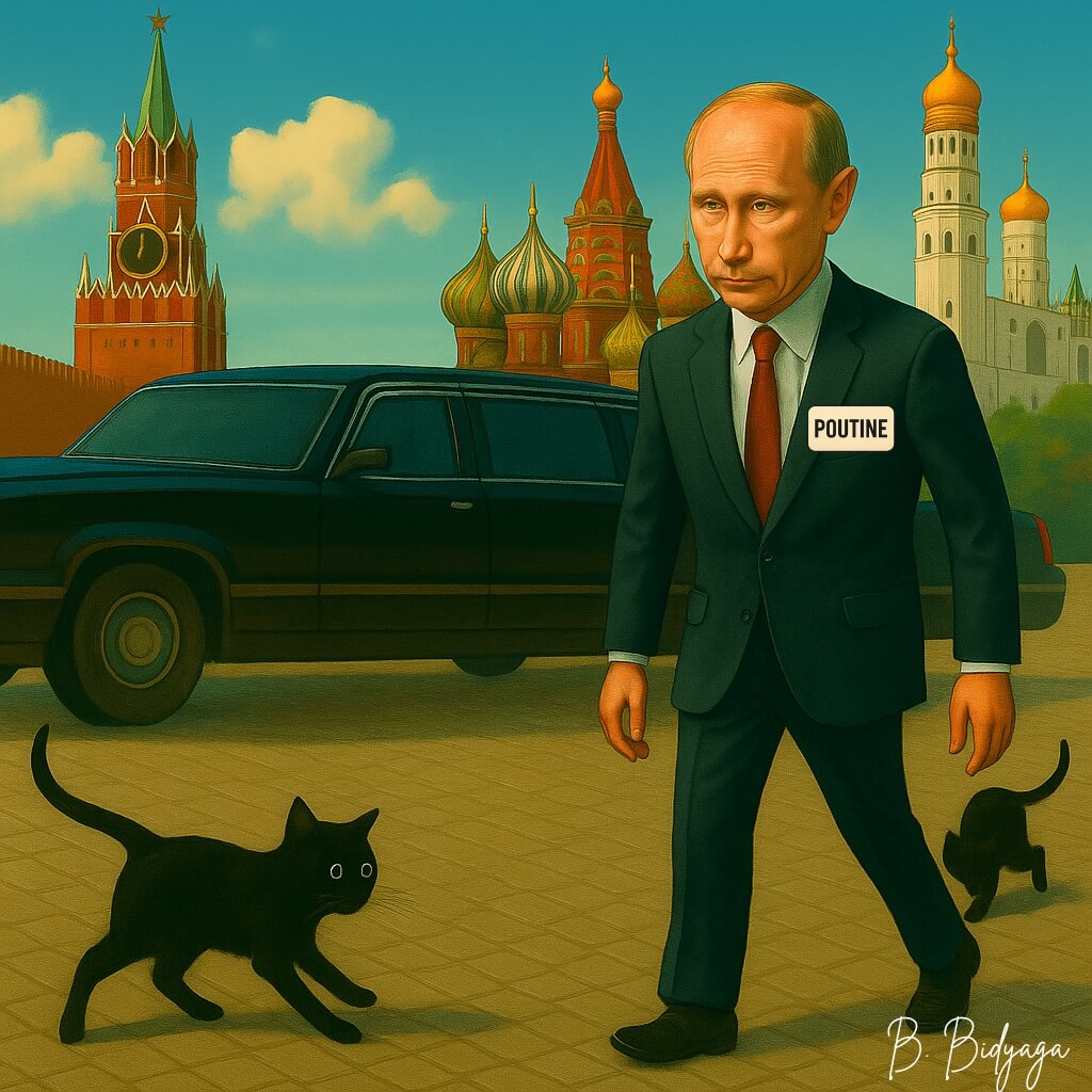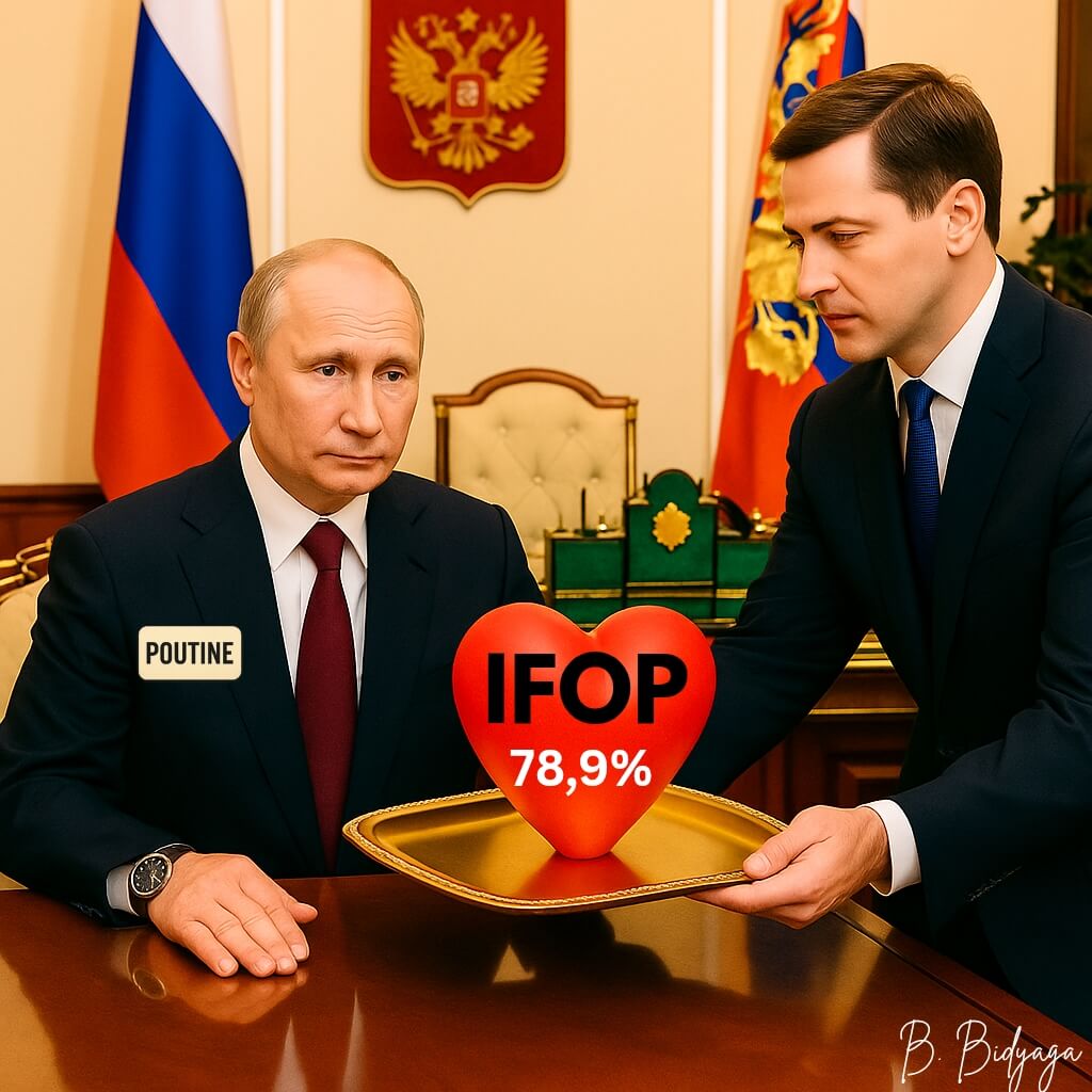 (Un silence s’installe. Poutine, perplexe, se gratte la nuque. La peau de son front se plisse ; on devine que ça turbine fort dans sa tête. Au bout d’une minute ou deux, son visage se détend ; il pose de nouveau ses mains sur les flancs décharnés de la Russie.)
